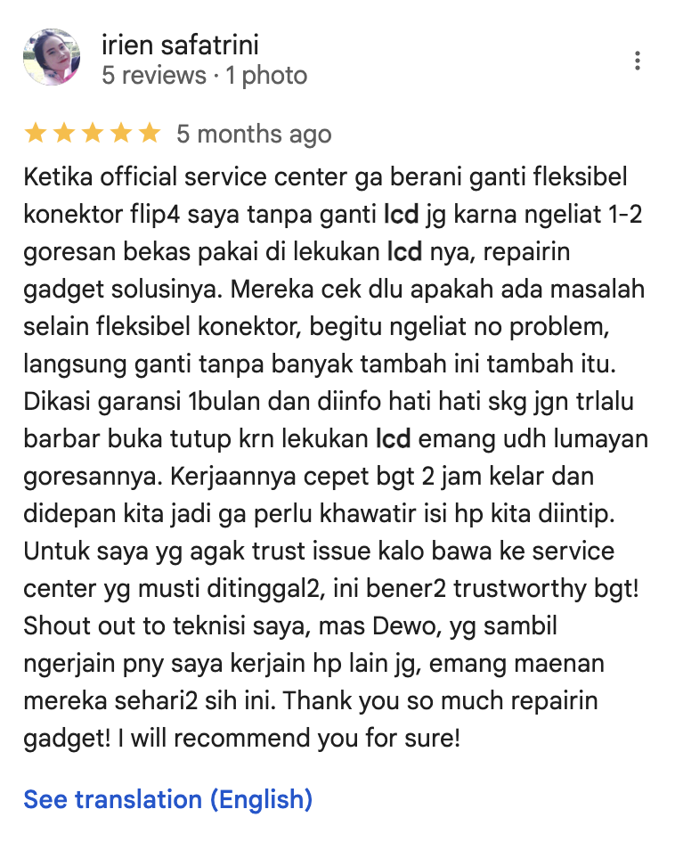 “Ketika official service center ga berani ganti fleksibel konektor flip4 saya tanpa ganti lcd jg karna ngeliat 1-2 goresan bekas pakai di lekukan lcd nya, repairin gadget solusinya. Mereka cek dlu apakah ada masalah selain fleksibel konektor, begitu ngeliat no problem, langsung ganti tanpa banyak tambah ini tambah itu. Dikasi garansi 1bulan dan diinfo hati hati skg jgn trlalu barbar buka tutup krn lekukan lcd emang udh lumayan goresannya. Kerjaannya cepet bgt 2 jam kelar dan didepan kita jadi ga perlu khawatir isi hp kita diintip. Untuk saya yg agak trust issue kalo bawa ke service center yg musti ditinggal2, ini bener2 trustworthy bgt! Shout out to teknisi saya, mas Dewo, yg sambil ngerjain pny saya kerjain hp lain jg, emang maenan mereka sehari2 sih ini. Thank you so much repairin gadget! I will recommend you for sure!”